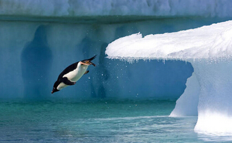 企鹅身躯笨重,没有可以用来攀爬的前臂,每次将要上岸时,它都要猛地低头,从海面扎入海中,拼力沉潜。潜得越深,海水产生的压力和浮力越大,当企鹅到达适当的深度,再迅猛向上跃起,便能如离弦之箭般穿出水面,落于陆地之上。